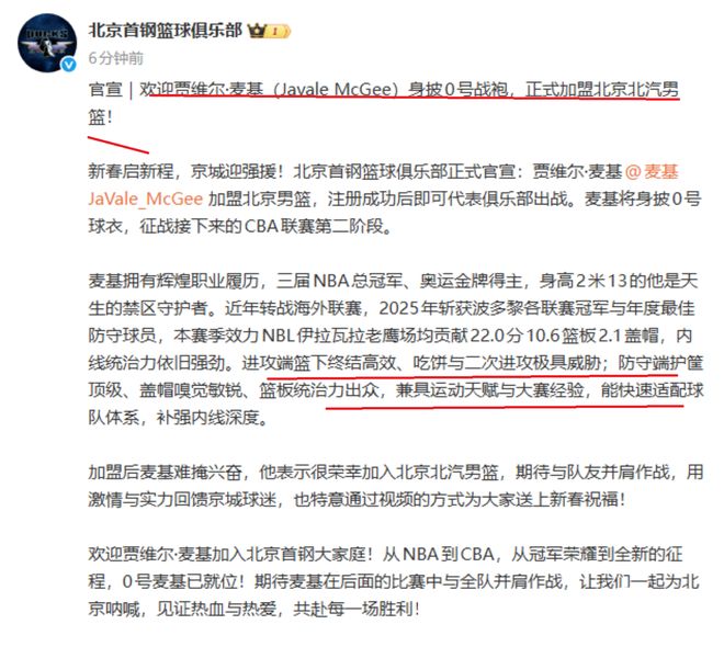 剛剛,北京隊(duì)宣布了一則重要消息,沒(méi)錯(cuò),那就是球隊(duì)正式簽約NBA總冠軍球員賈維爾·麥基,接下來(lái),賈維爾·麥基將會(huì)代表北京隊(duì)參加CBA第二階段的比賽,同時(shí),他將會(huì)穿北京隊(duì)0號(hào)球衣。